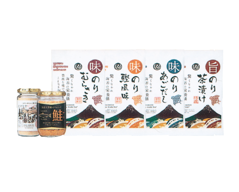 味付け海苔:(8切32枚)×1・30枚(12切5枚×6袋)×1、かつお味付海苔(8切32枚)×1、あごだし味付海苔30枚(12切5枚×6袋)×1、特金:松茸風味お吸い物(2.5g×3袋)×1、いつものふりかけ(2.5g×4袋)×1【卵・乳・小麦・えび】箱/165×75×250㎜