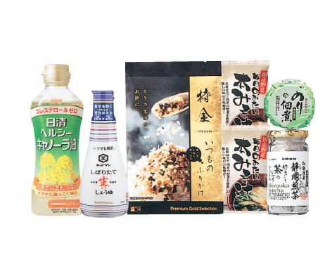 キッコーマンいつでも新鮮しぼりたて生しょうゆ200㎖×1、日清ヘルシーキャノーラ油350g×1、純国産野菜みそ汁×2、島乃香のり佃煮80g×1、特金いつものふりかけ(2.5g×4袋)×1、静岡煎茶テトラティーバッグ2.5g×10P(真空瓶)×1 【卵・乳・小麦】 箱/165×75×250㎜